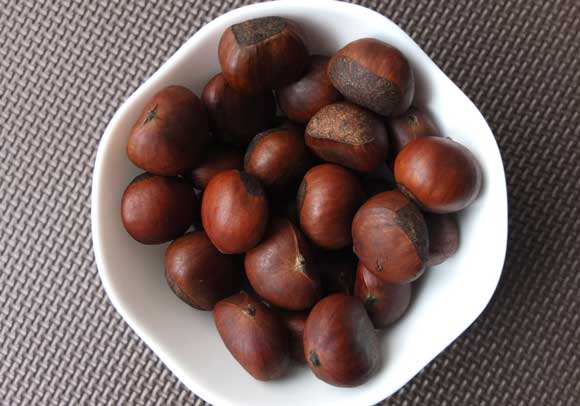 まずは栗の平らな面の中央に親指の爪を立てて、軽く割れ目を入れます。